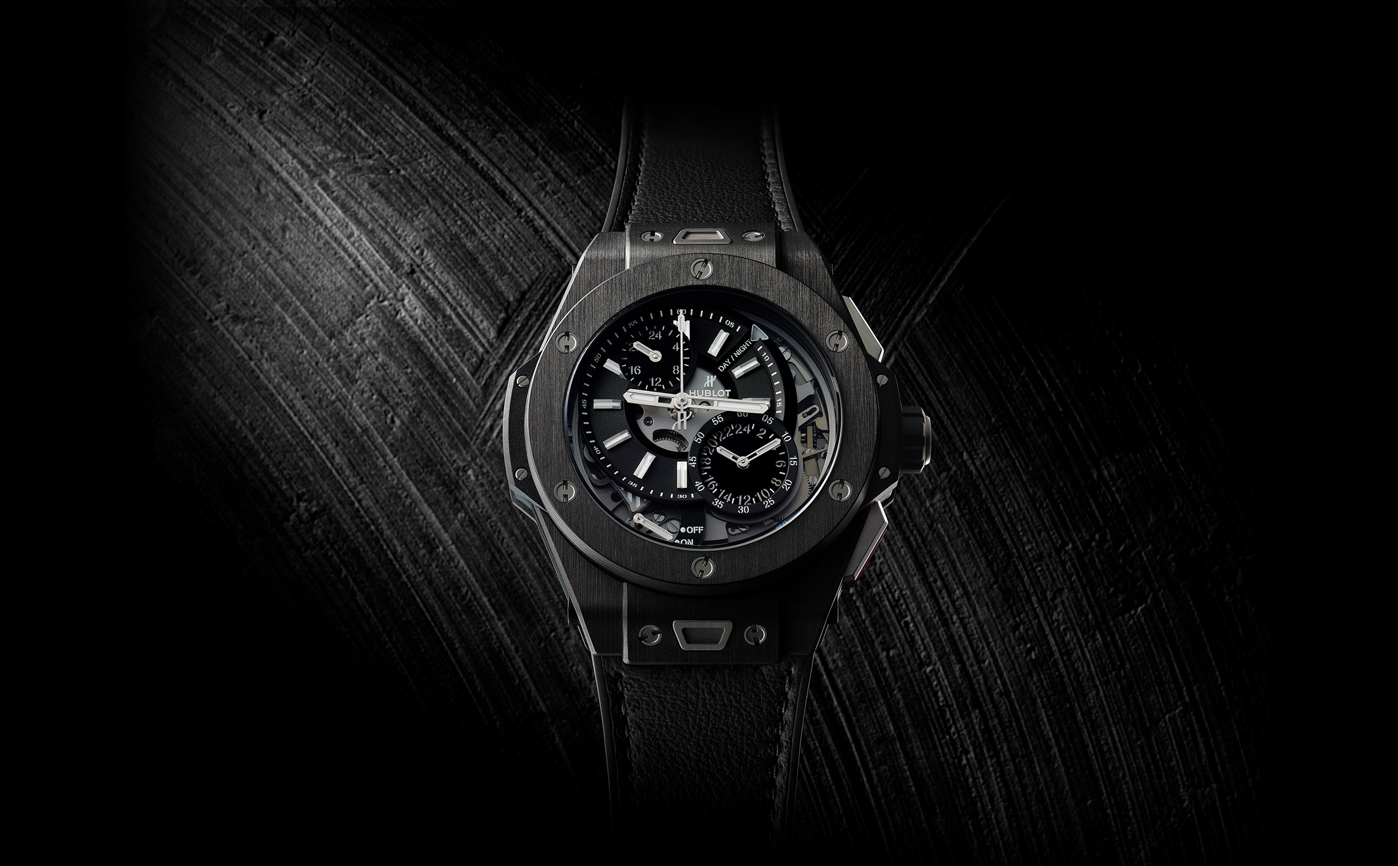 ワンプッシュクロノグラフに加えトゥールビヨンとカテドラルミニッツリピーター(ウエストミンスター教会の鐘音)機能を装備する最高レベルの複雑時計。雑音を極めて抑えたリピーター音はウブロの技術力の証左である。パワーリザーブ約85時間の手巻きCal.HUB8110搭載。精悍なカーボンファイバーケースを採用。