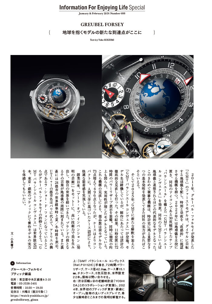 2011年、グルーベル・フォルセイが発表した「GMT」のファーストモデルは、ダイヤルに自転する地球儀を配し、時刻と昼夜を"直感的"に視認させる機構を持つ。・・・