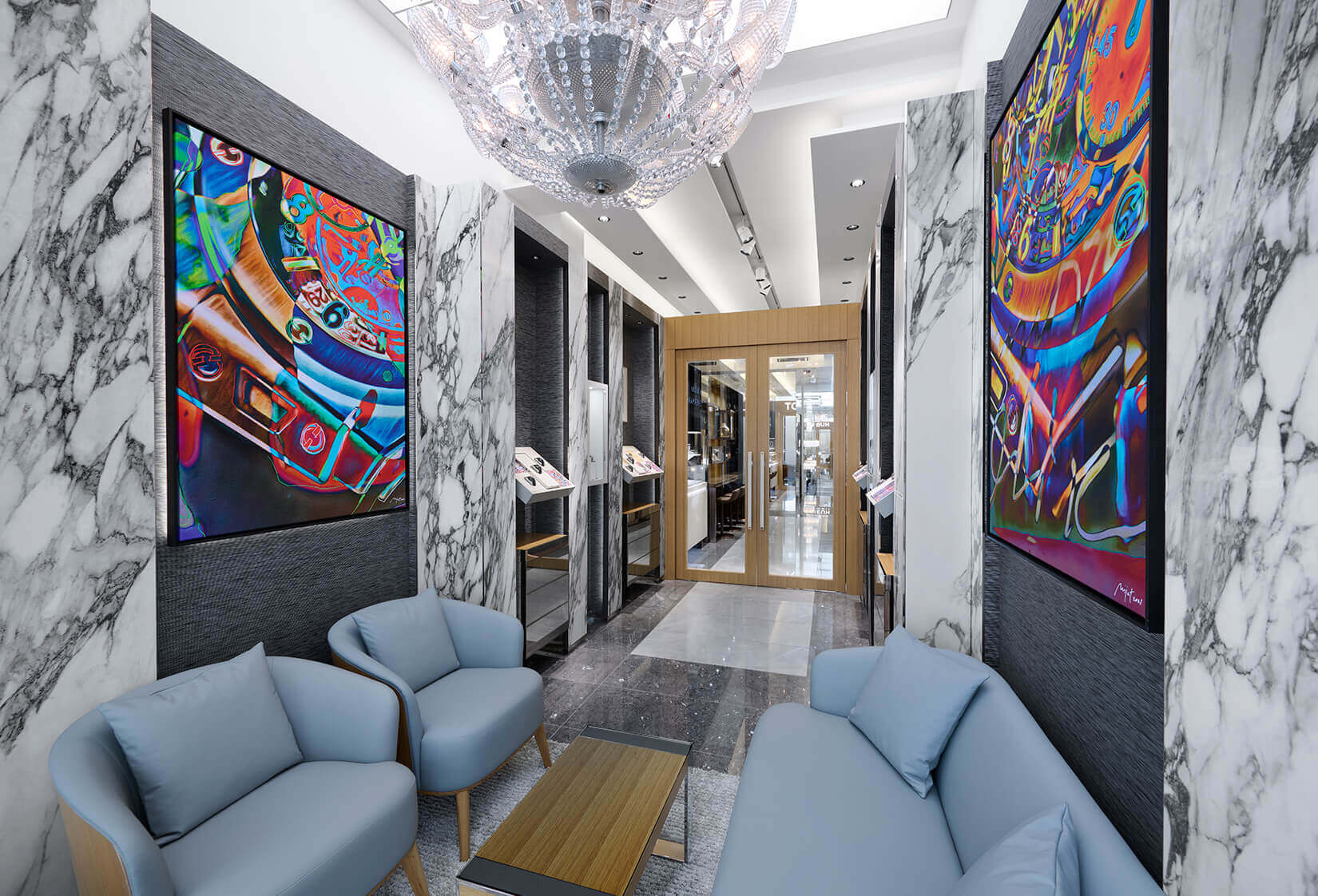 マーブルの大理石やミラーなどモノトーンを基調としたシックな空間にウブロの色彩豊かなポップアートが見事に融合。